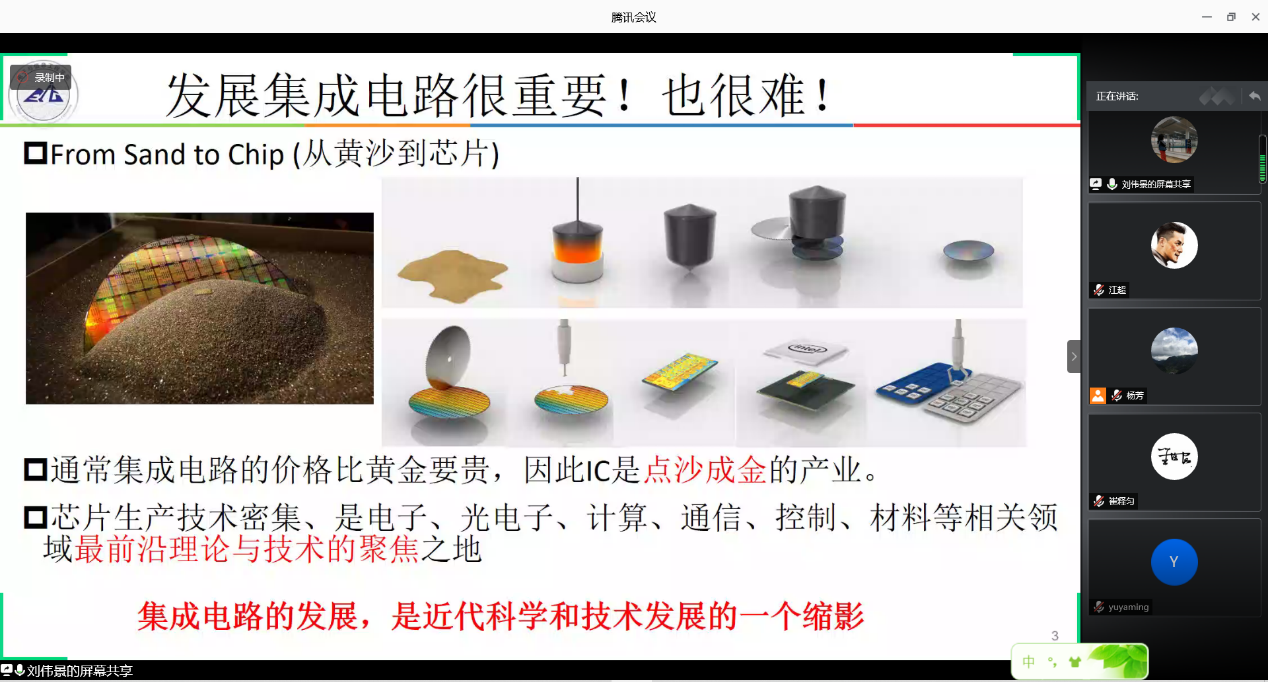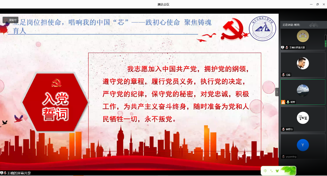 7月15日下午,bevictor伟德国际电子科学学科教工党支部专题组织生活展示在腾讯会议举行。此次活动主题为“立足岗位担使命,唱响我的中国‘芯’”。由电子与信息工程公司党委副书记周冬梅主持,电子科学学科教工党支部全体党员以及各公司党员代表参加了此次活动。