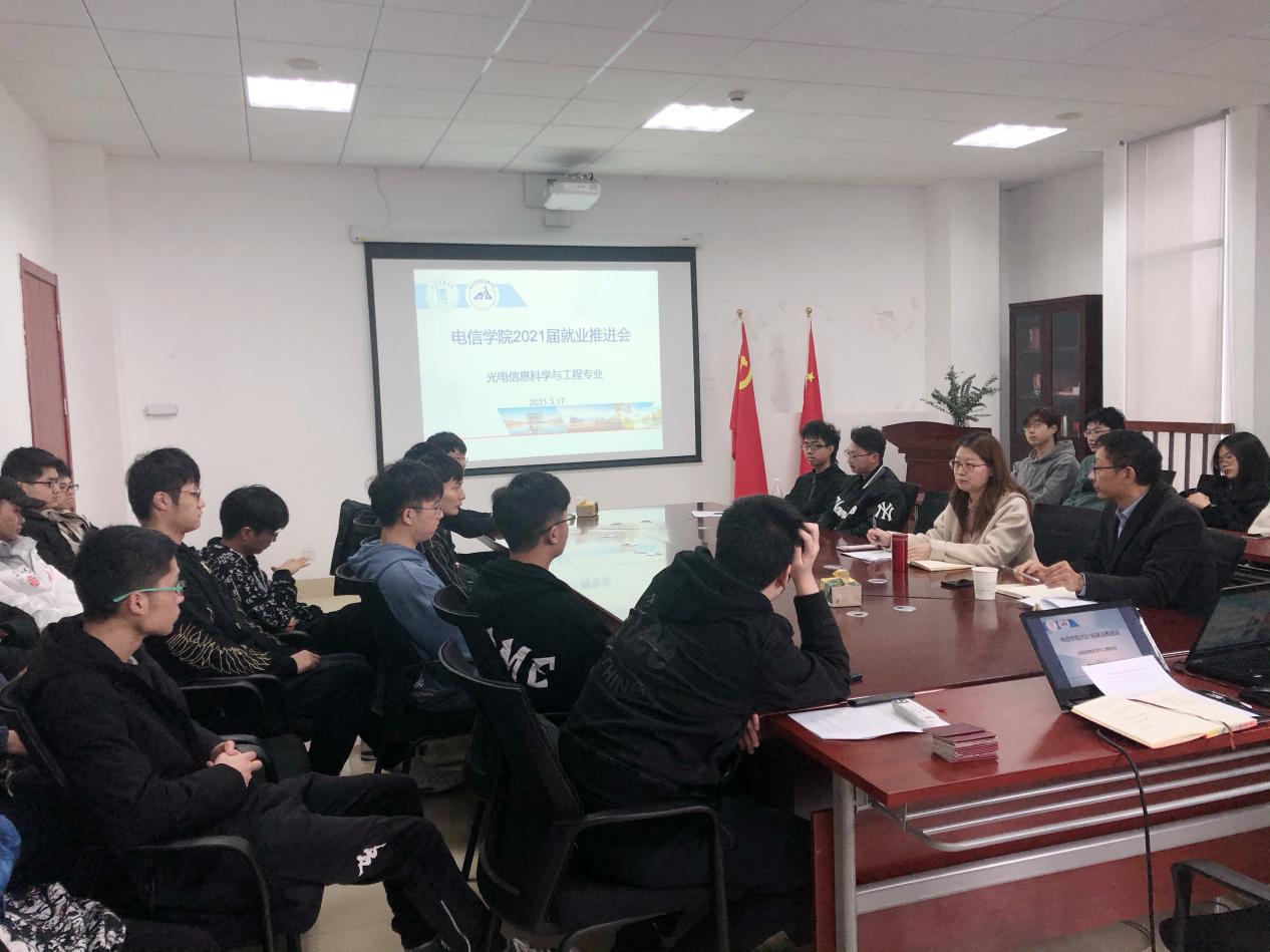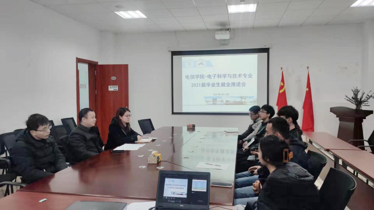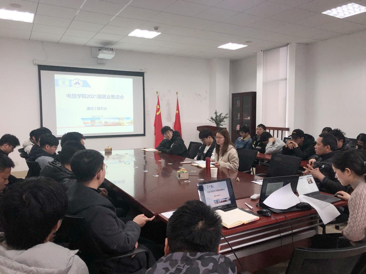 一年之计在于春,为进一步推进2021届毕业生就业工作,把握春季招聘良机,提高毕业生就业质量,3月15-17日,电信公司在电信楼402会议室分专业召开了4场就业推进会,电信公司党委书记潘耀芳、党委副书记周冬梅和各学科主任出席会议,2021届未就业员工参会,会议由毕业班辅导员崔释匀、任帼菲分别主持。