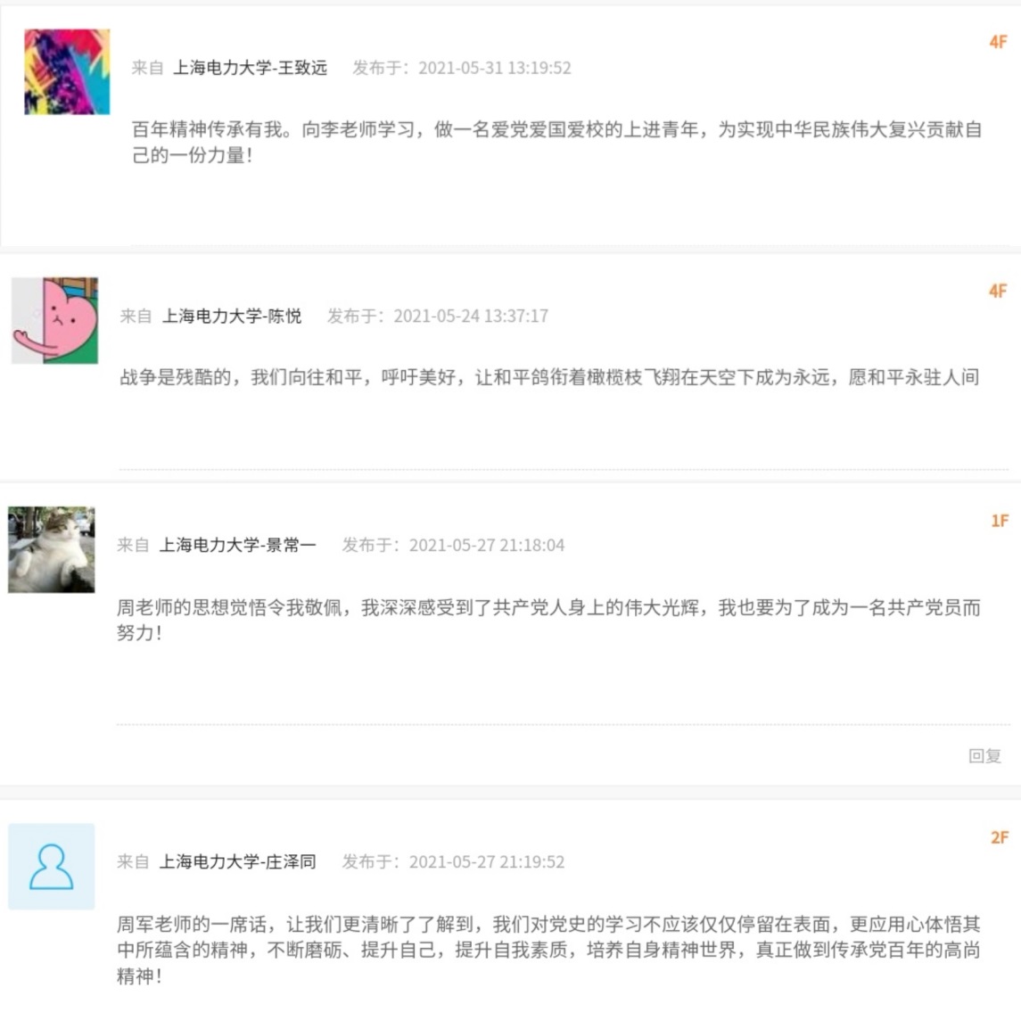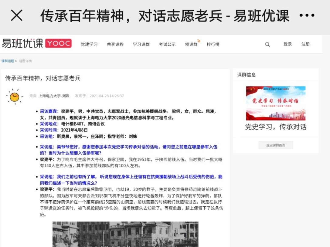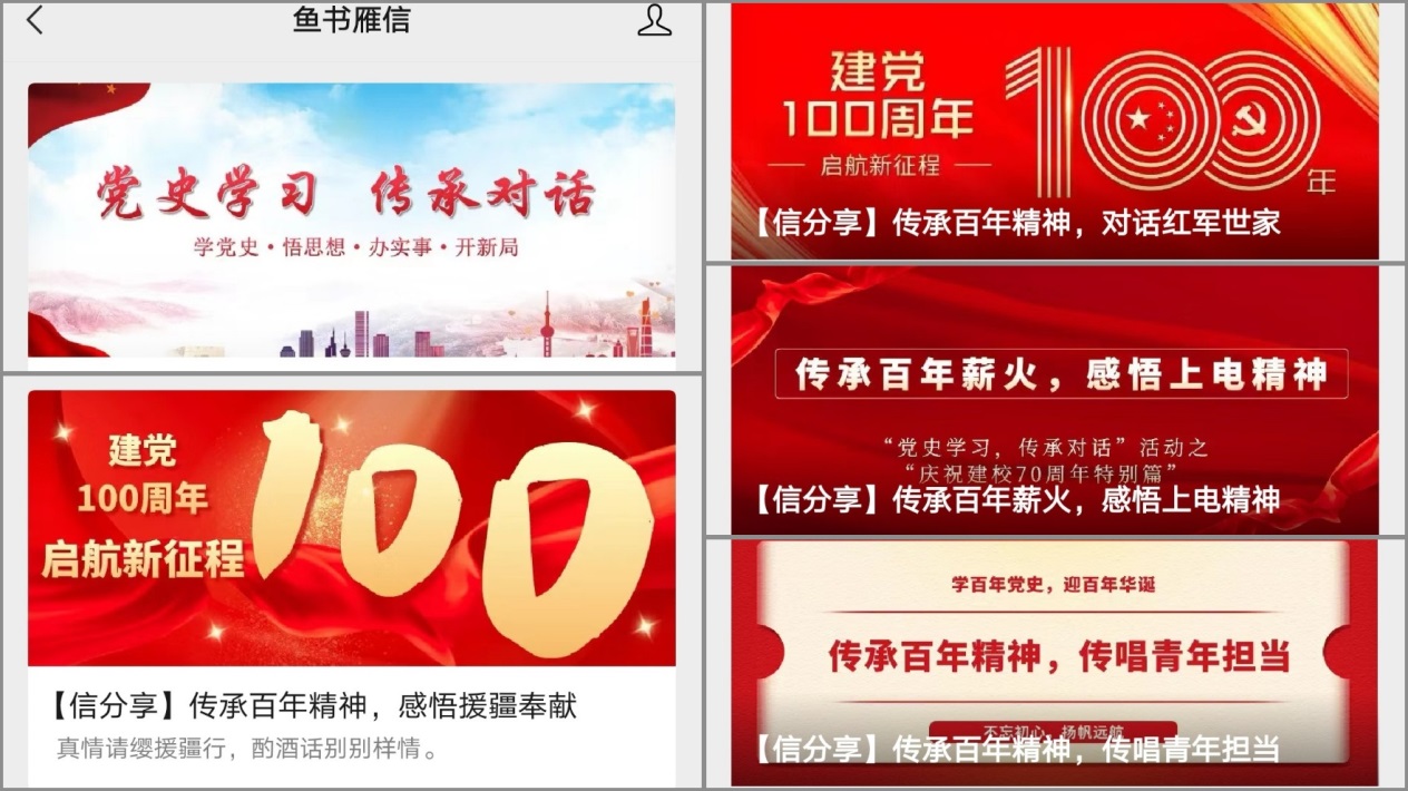 本次“党史学习,传承对话”活动,形式新颖,内容丰富,公众号与易班平台在发出后也收到了同学们的积极留言。同学们纷纷表示作为新时代的老员工,更应牢记革命先辈们用生命与热血书写下的百年党史,传承共产党员的优秀品质。下一步,电信公司将继续围绕党史学习教育开展系列活动,培养员工党性底蕴,以优异成绩迎接建党一百周年!