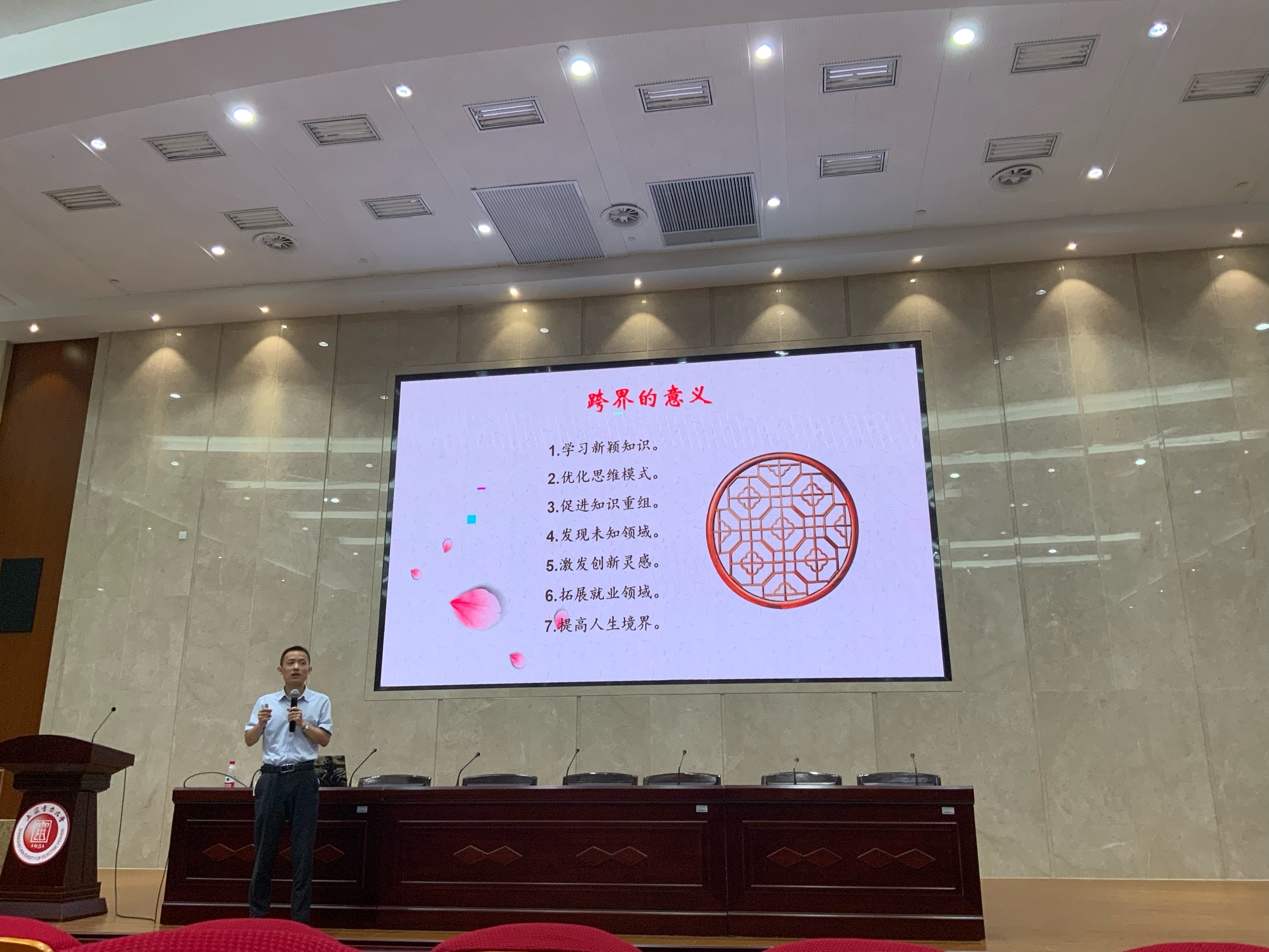 杨潇针对“主动求变”和“被动受变”两方面的对比,阐述了跨界的原因,结合具体的实例为同学们指出了跨界的意义,跨界不仅能够学习新颖知识、优化思维模式、促进知识重组、发现未知领域,而且还可以激发创新灵感、拓宽就业渠道、提高人生境界。跨界实际上是现代社会对复合型人才的一种需求,抱有对各类新知识学习的兴趣,是做到跨界的前提。最后杨潇也为同学们指明了跨界的途径,鼓励同学们多学习、多思考、多实践,勇于挑战,大胆尝试,做好人生规划,努力实现自我价值。