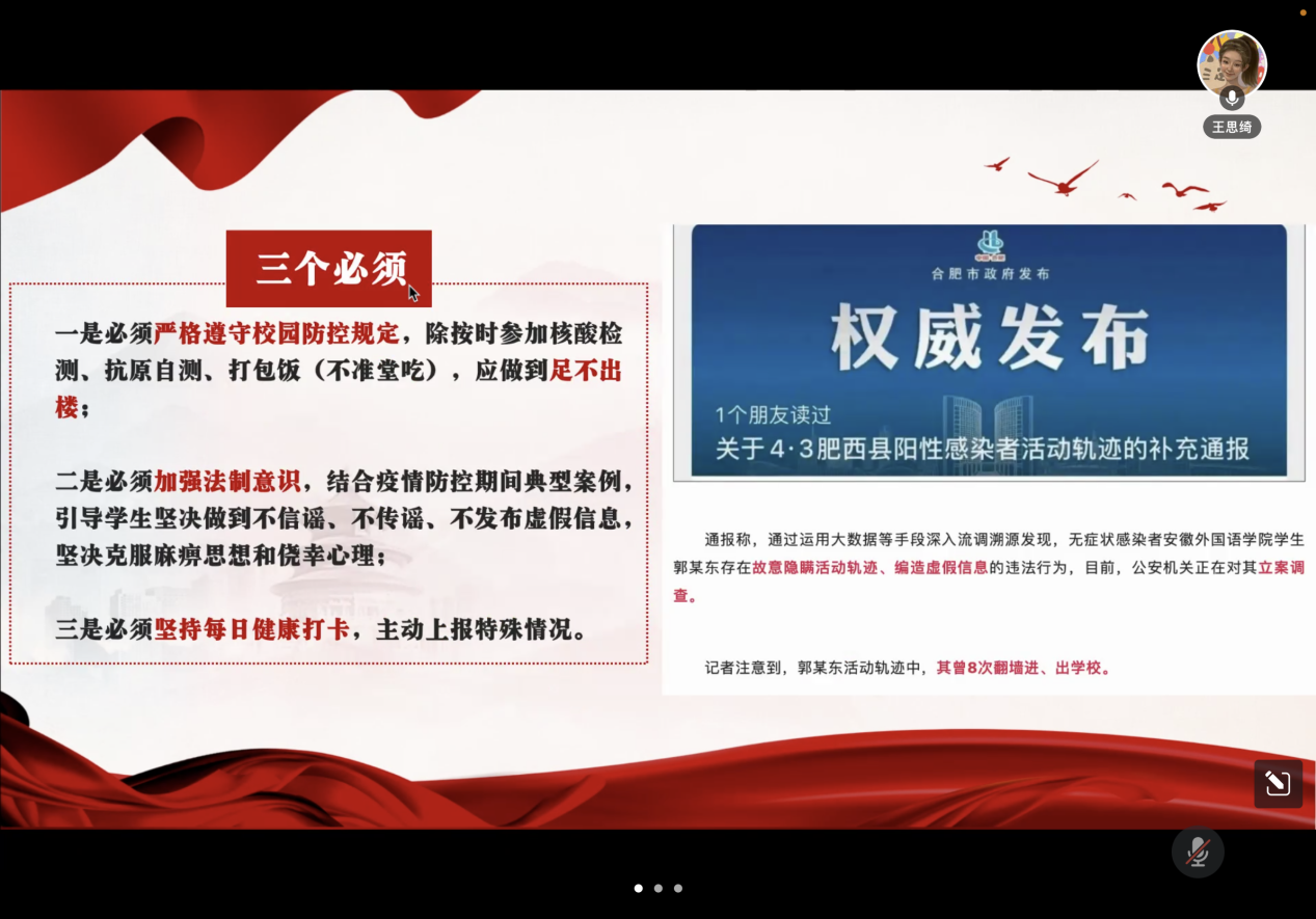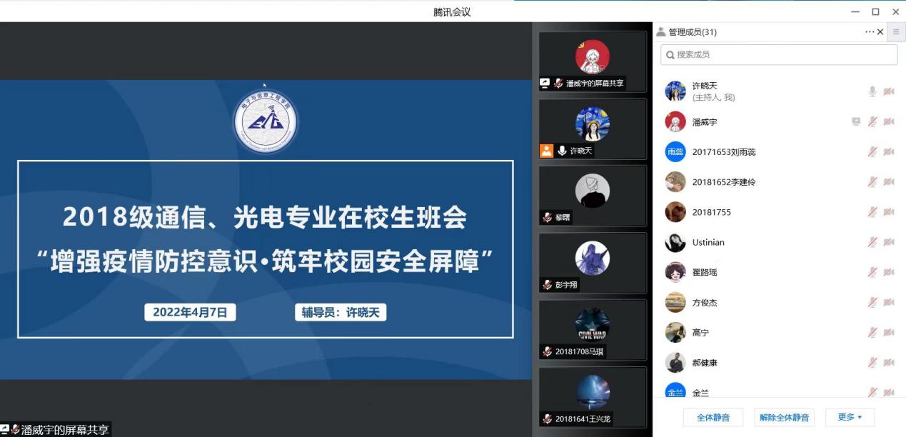 为进一步从严从实、从细从紧做好疫情防控工作,引导员工增强防控意识,遵守防控要求,形成抗疫合力,引领员工树立抗疫必胜的信心和决心,电信公司辅导员积极落实公司疫情防控工作要求,组织开展多主题班会,精准传达最新防控政策,引导员工积极参与讨论,增强员工对于当前防控形势和相关防控政策的深层次理解,以实际行动践行青年学子的责任担当。