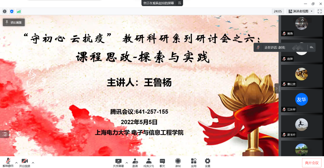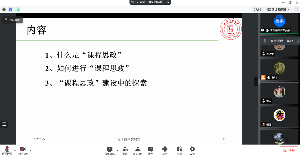 5月5日,bevictor伟德国际邀请了电气工程公司电子教研室主任王鲁杨老师在腾讯会议线上为公司教师主讲题为《课程思政-探索与实践》的学术讲座。公司党政班子领导和各专业教师参加了会议。