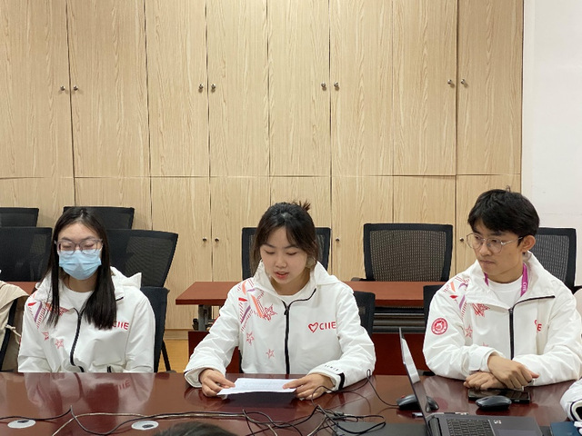 周冬梅介绍了电信公司第五届进博会志愿者的总体情况。电信公司积极响应校团委的部署,九月底开展进博会志愿者招募工作,共计67名同学积极报名参加,经过层层筛选,最终选拔出10名进博会志愿者。其中,研究生1人,本科生9人。10人中,有2人参加过进博会志愿服务;7人参加过社会实践,占总人数的90%。本届进博会电信“小叶子”的工作主要分布在展务、进博会信息系统综合岗、入场证件服务点三大岗位。