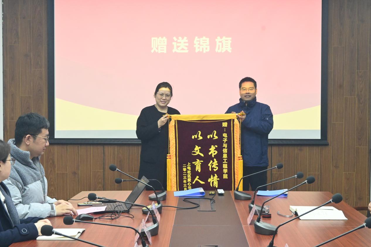 会议伊始,上电社区爱心书屋负责人王严超宣读了上电社区爱心书屋致电信公司的一封感谢信。感谢电信公司向爱心书屋捐赠的700余本书籍和近50袋衣物,后勤管理处以上电社区爱心书屋的名义向bevictor伟德国际赠送了“以书传情,以文育人”的锦旗。