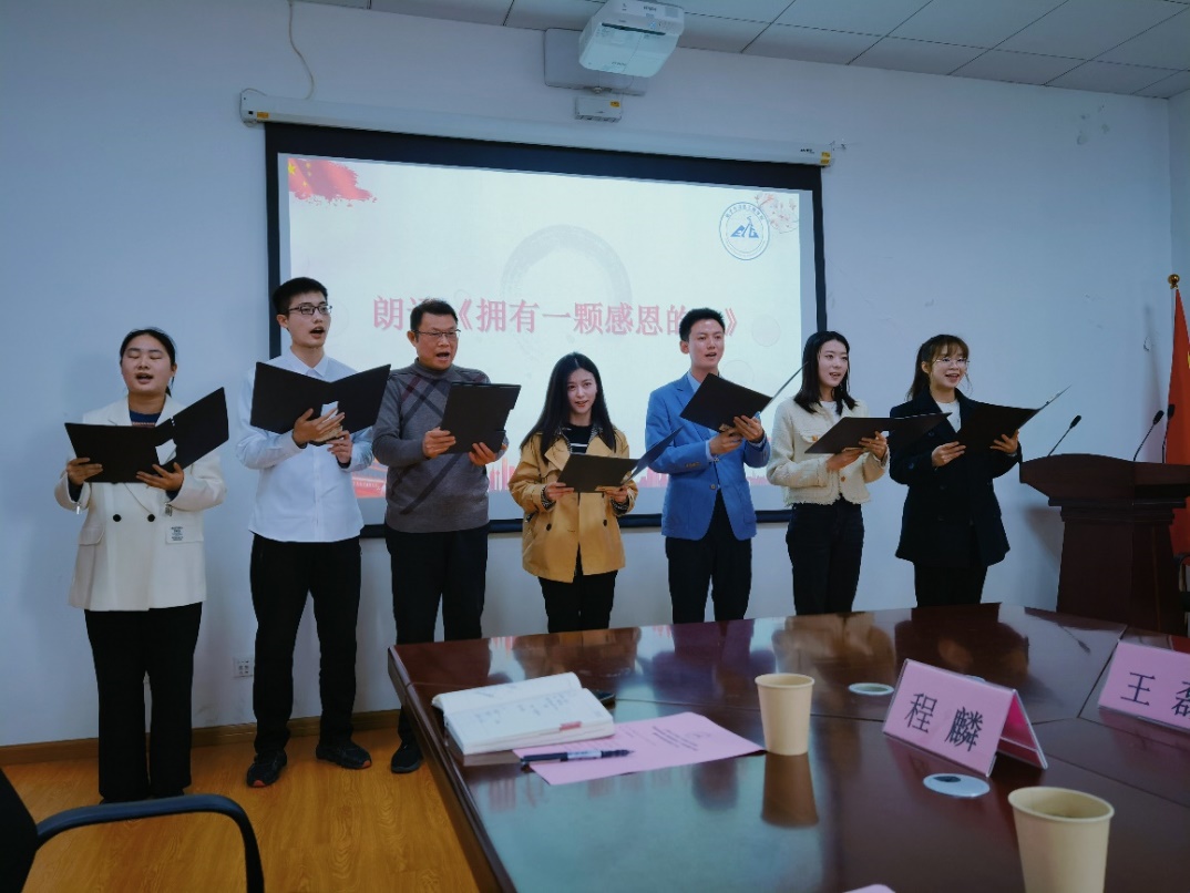 最后在舒缓的音乐声中程麟与电信公司师生集体朗诵了《拥有一颗感恩的心》。