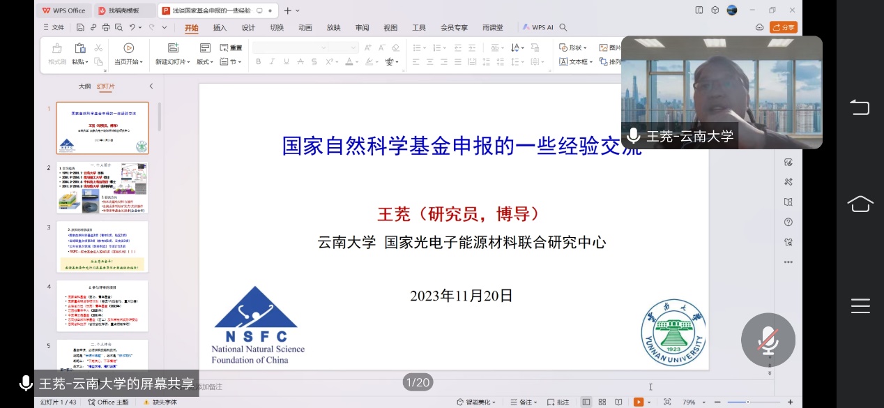 11月20日晚上19:30,bevictor伟德国际邀请云南大学材料科学与工程公司王茺研究员进行题为“国家自然科学基金申报的一些经验交流”讲座。会议由薛亮副经理主持,使用腾讯会议线上进行,约60余名公司教师及研究生参加了讲座。