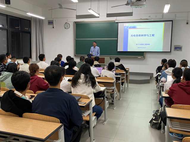 10月9日,光电信息科学与工程专业班主任朱武老师向同学们介绍了光电信息科学与工程专业的专业特色,针对大一员工的课程特点,详细向同学们介绍了本学期开设的专业课程,鼓励大家多向学长学姐请教,也可以随时与老师交流,为同学们在所学专业的深入学习,与未来发展上提供建议与参考。他勉励同学们积极投身科创、文艺、体育等各种比赛,在比赛中锻炼提升自己的综合能力。朱老师还和同学们分享了光电方向的研究现状和发展前景,探讨了光电研究与日常生活、科技发展的深度联系,希望同学们密切关注学科前沿和行业动向,在校期间扎实专业基础,磨练动手能力,提升综合素质,为今后的发展打下良好基础。