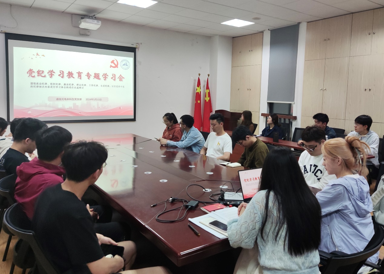 为深入开展党纪学习教育,进一步使党纪党规入脑入心,引导党员不断增强纪律意识,在支部内营造学纪、知纪、明纪、守纪的良好氛围,5月15日晚上,通信光电本科生党支部在电计楼B402会议室开展《中国共产党纪律处分条例》学习和党纪学习教育专题学习会,联系支部的电信公司党委书记何西培和支部全体党员参会,会议由支部书记刘甘雨主持。