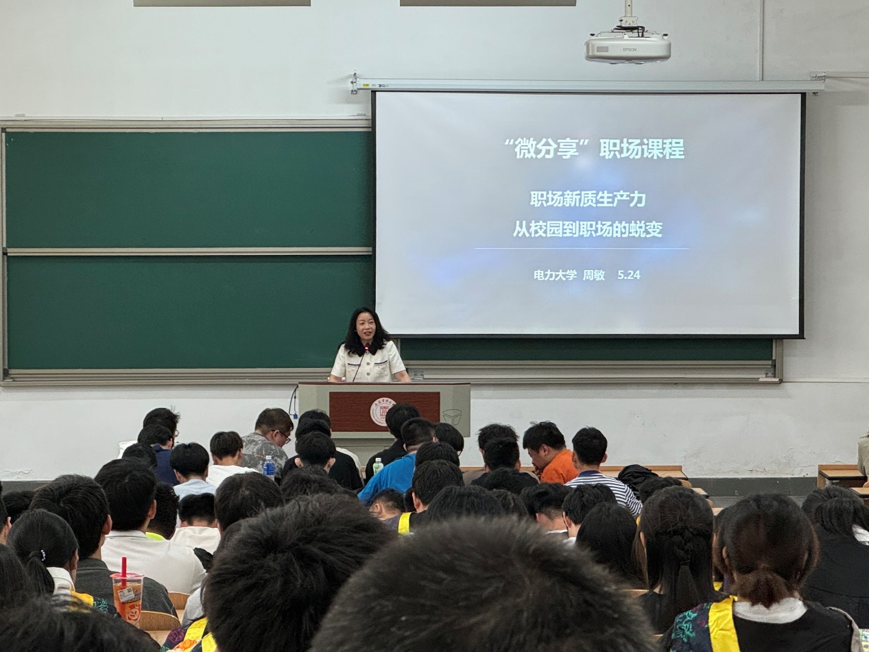 周敏结合企业工作经验,从心理建设、技能提升、职业规划三个部分出发,带领同学们进行自我剖析,借助就业训练营中的模拟面试案例,分享了如何做好职场心理建设,做好情绪管理与有效表达,完成从职场“适应-融入-胜任”的过程。在技能提升方面,她强调企业对结果导向的追求,提倡提前学习职业技能,不断提升职场核心竞争力,从而适应从“校园人”到“职场人”的转变。在职业规划方面,周敏强调,未来社会需求缺口趋向复合型人才,只有把握高效性、创新性、可持续性和融合性等核心要点的人才,才能跻身于时代发展前列。