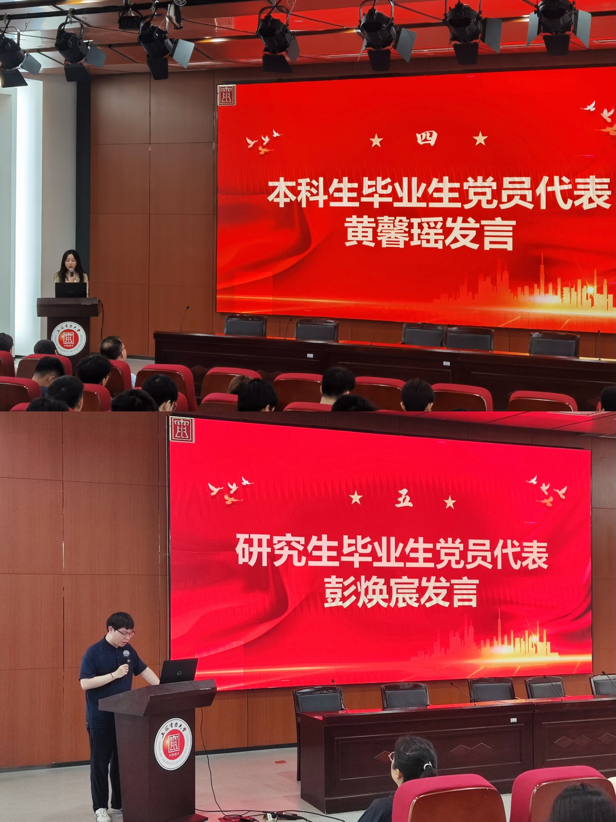 青春当奋斗,扬帆启征程。电子电科本科生党支部党员黄馨瑶和通信光电本科生党支部党员彭焕宸作为毕业生党员代表发言。黄馨瑶表示,感谢公司、公司和老师们的悉心培养,作为一名本科生党员,在未来的道路上会时刻牢记“爱国、勤学、务实、奋进”的校训和“立德、求知、创新、求是”的院训,做怀揣梦想脚踏实地、拥有智慧富有激情和德才兼备敢挑重任的人,用行动和奋斗书写属于电信公司、属于新时代上电人的华彩篇章。彭焕宸表示,虽然即将毕业离开母校,但在新的工作岗位上,会时刻牢记母校的嘱托,主动担当,敢想敢干,敢试敢闯,用奋斗书写青春答卷,不负时代赋予的重任,在平凡的岗位上,埋头钻研,不断锤炼自身本领,在推进强国建设、民族复兴伟业中展现青春作为,彰显青春风采。