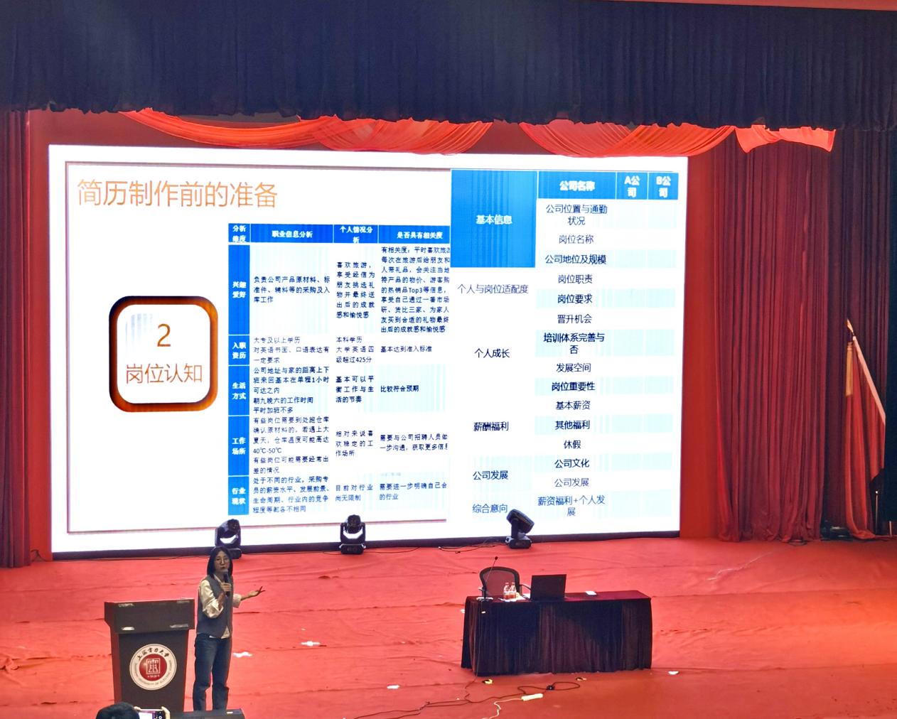 随后,武亭从企业视角介绍了简历筛选逻辑,表示除基本信息之外,同学们要重点展示与企业招聘岗位的相关性,在简历中突出主修课程与应聘岗位的相关度,合理展现自身实习经历与工作稳定度,最大化展现个人优势,从而受到应聘企业的青睐。
