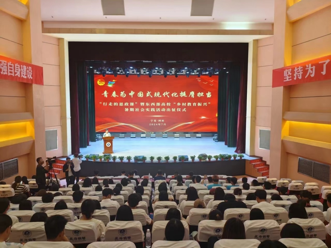 7月8日,伟德国际唯一官网、宁夏师范大学、闽南师范大学、北方民族大学联合开展“青春为中国式现代化挺膺担当”——“行走的思政课”暨东西部高校“乡村教育振兴”暑期社会实践活动。出征仪式在宁夏师范大学举行,宁夏师范大学党委副书记吴孝出席并讲话授旗,公司电信公司团委书记李天成带领赴宁夏暑期社会实践队参加了本次活动。