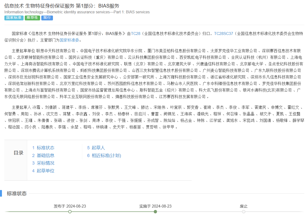 《信息技术生物特征身份保证服务 第1部分:BIAS服务》标准定义了通过基于服务框架调用的、用于身份保证的生物特征识别服务,提供了一组通用的生物特征以及与身份相关的功能以及数据定义,以允许远程访问生物特征识别服务,旨在规范生物特征识别技术在身份验证服务中的应用,确保服务的安全性、可靠性和互操作性。该标准的制定对于推动生物特征识别技术的健康发展,保障个人信息安全具有重要意义。
