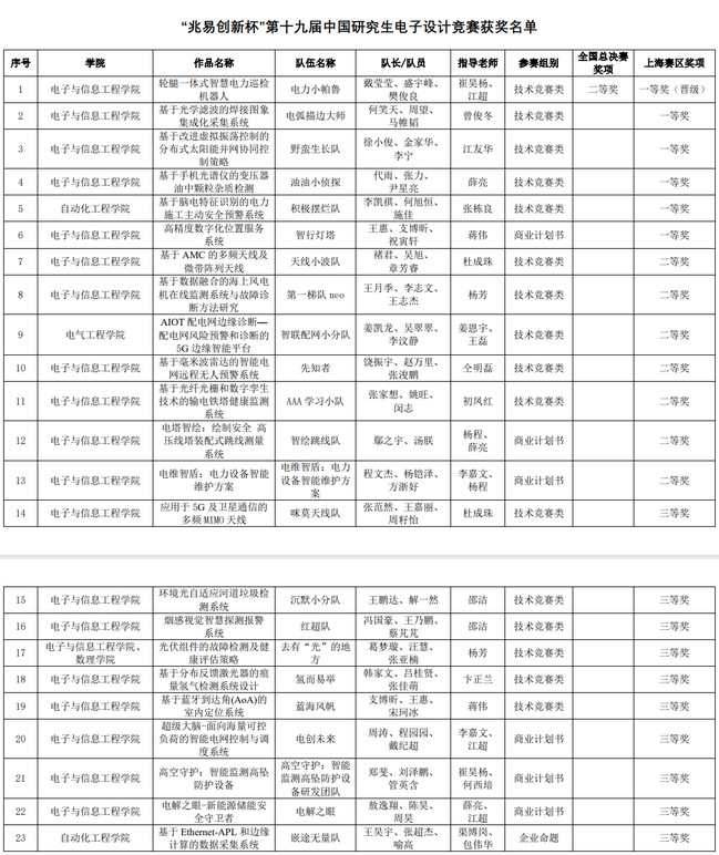 本届大赛公司共选拔29支参赛队伍,最终24支队伍获奖,获得各类奖项共31项。公司最终荣获全国总决赛二等奖1项;在上海赛区比赛中,荣获技术竞赛类一等奖5项(1项晋级)、二等奖5项、三等奖6项;商业计划书类一等奖1项、二等奖2项、三等奖3项;企业命题类三等奖1项。公司荣获“上海赛区优秀组织单位”(共6所高校)。崔昊杨、曾俊冬、江友华、薛亮、张栋良、蒋伟6位指导教师被评为“上海赛区优秀指导教师”。